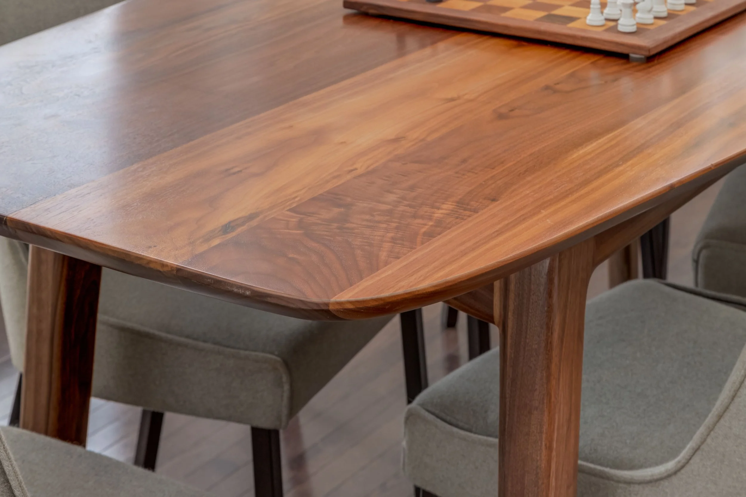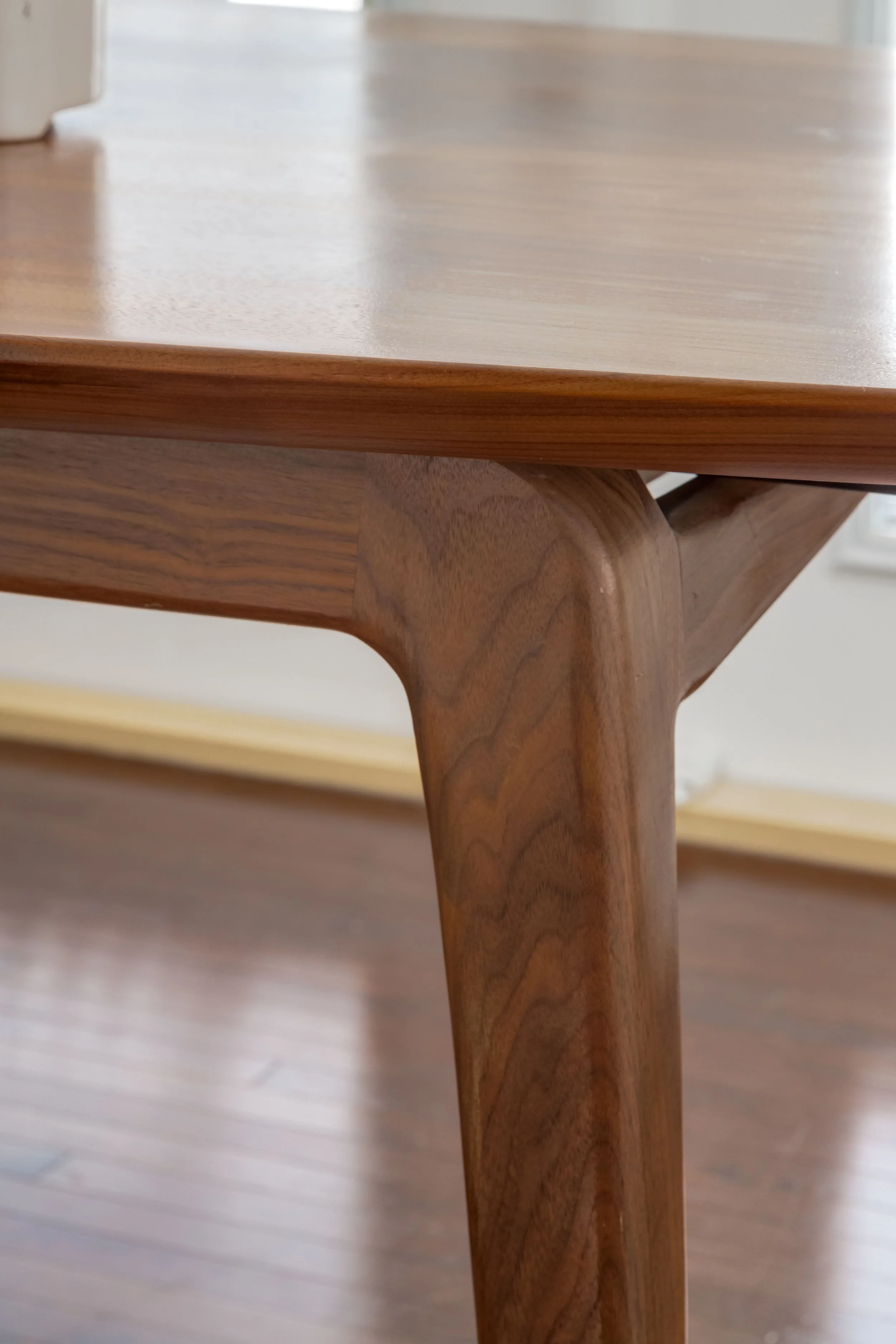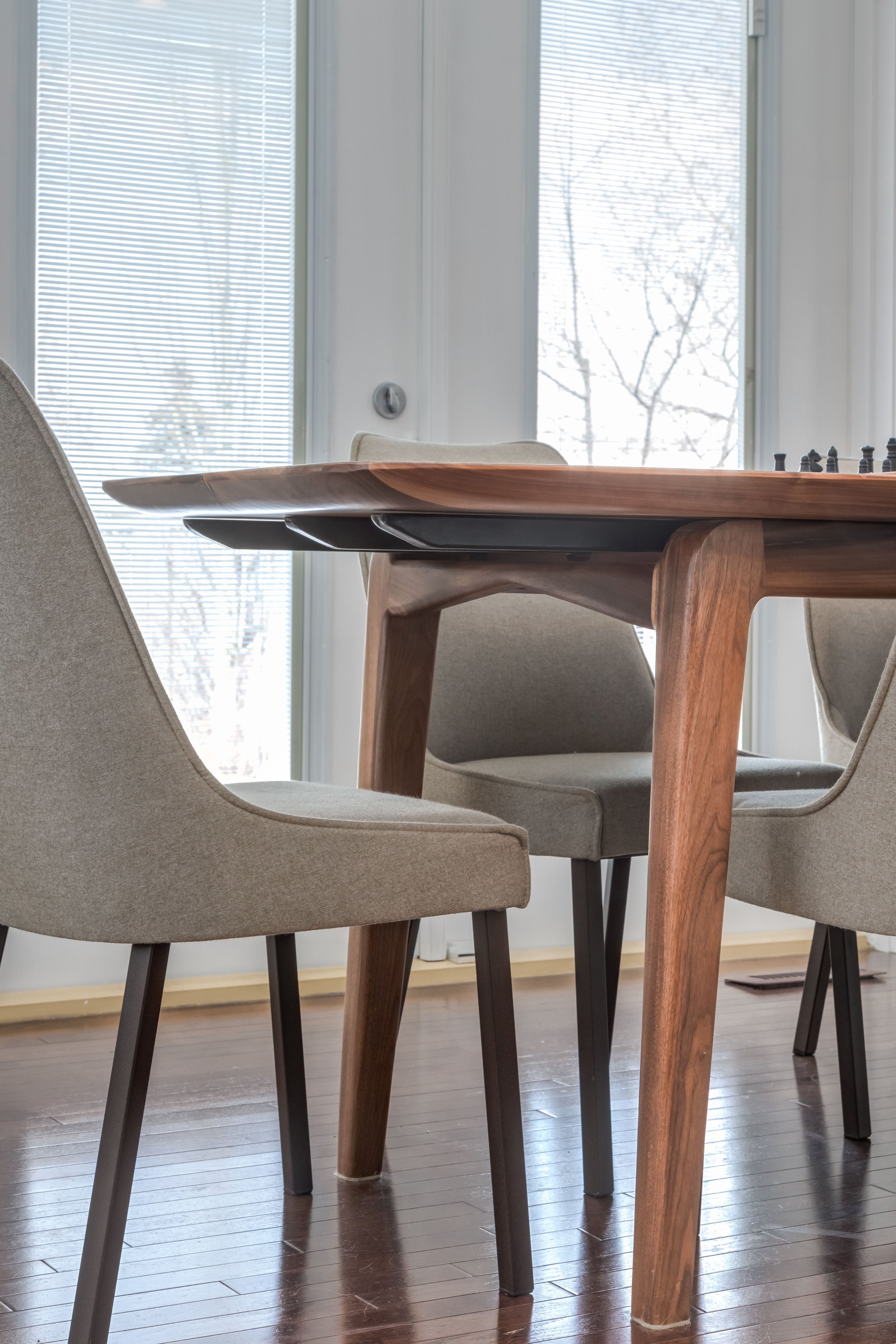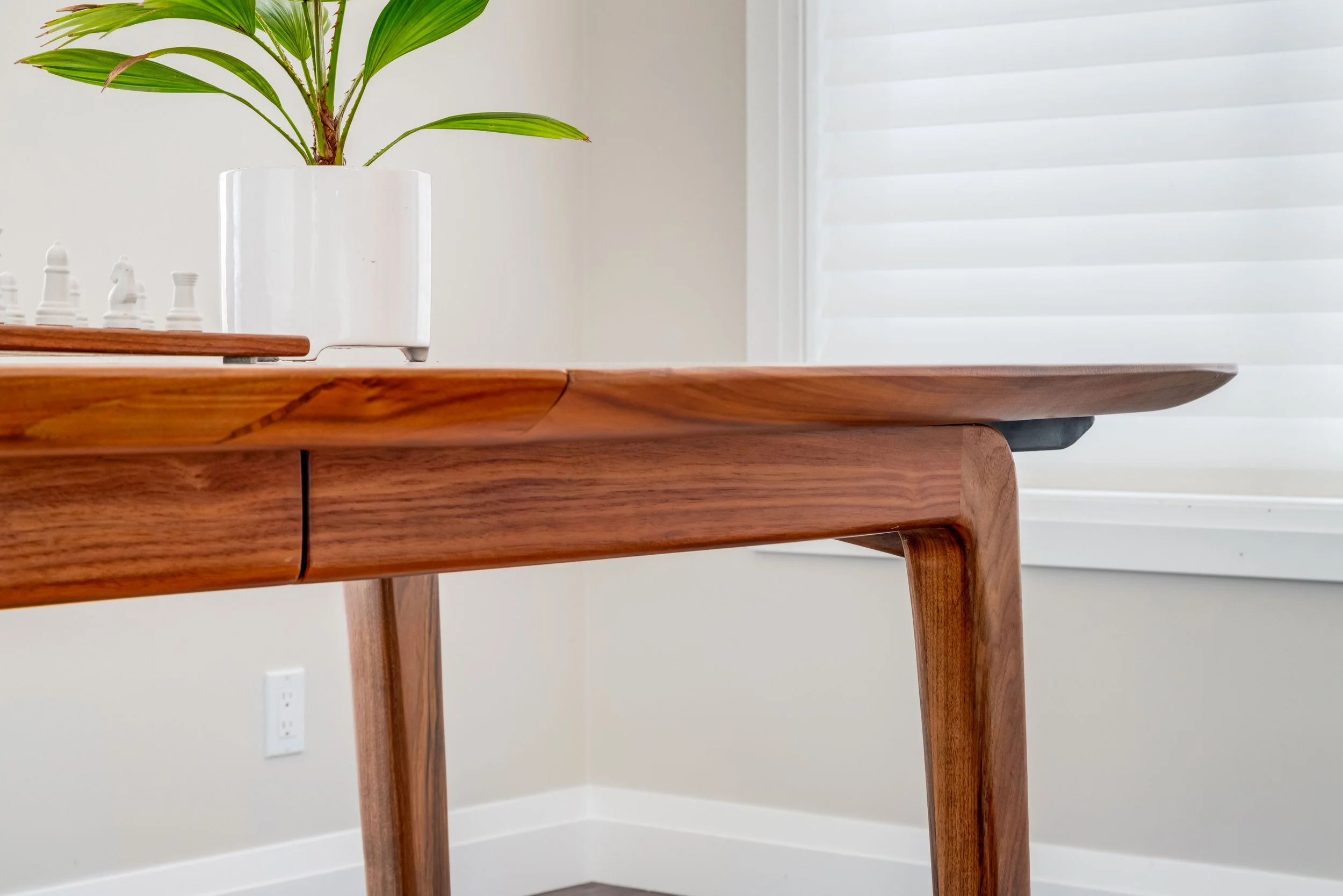 This table started with a client who had seen a table on a popular television show set in the 1950s. It was six sided and very mid century in style. The client loved the shape but wanted an updated, more organic feel to their table. This table features a central leaf that rides upon 3 pieces of metal rails with a 60 degree bevel cut to match the bevel of the table edge. The table top is 1.625 inches solid walnut with a sculpted, cut back edge which tapers to a 1/4 inch reveal. The top features a grain through construction to appear as one solid piece despite the centre opening. The legs are solid wood and elegantly tapered and are connected to the centre stretcher rails via mortise and tenon joinery. Absolutely elegant from every angle.