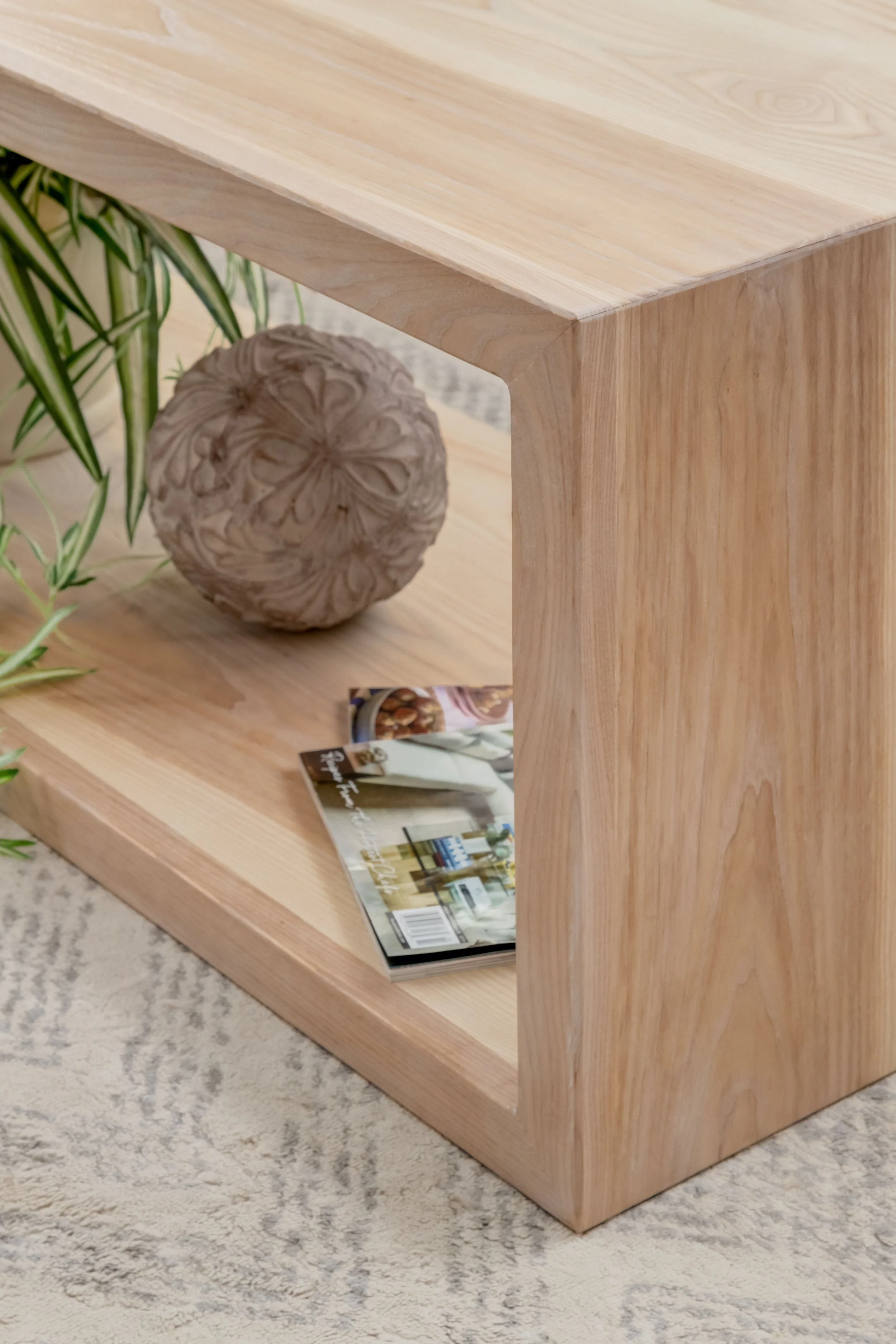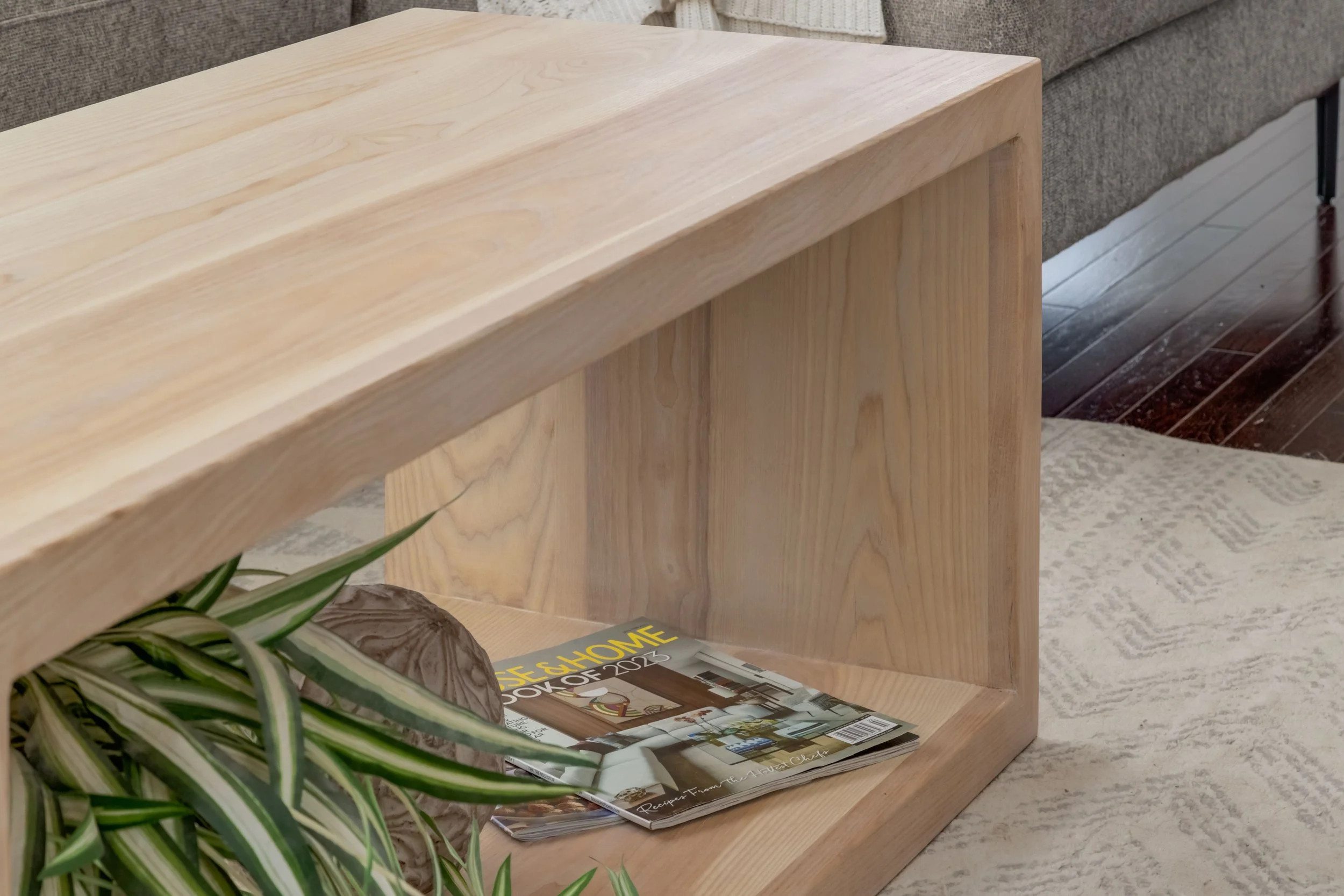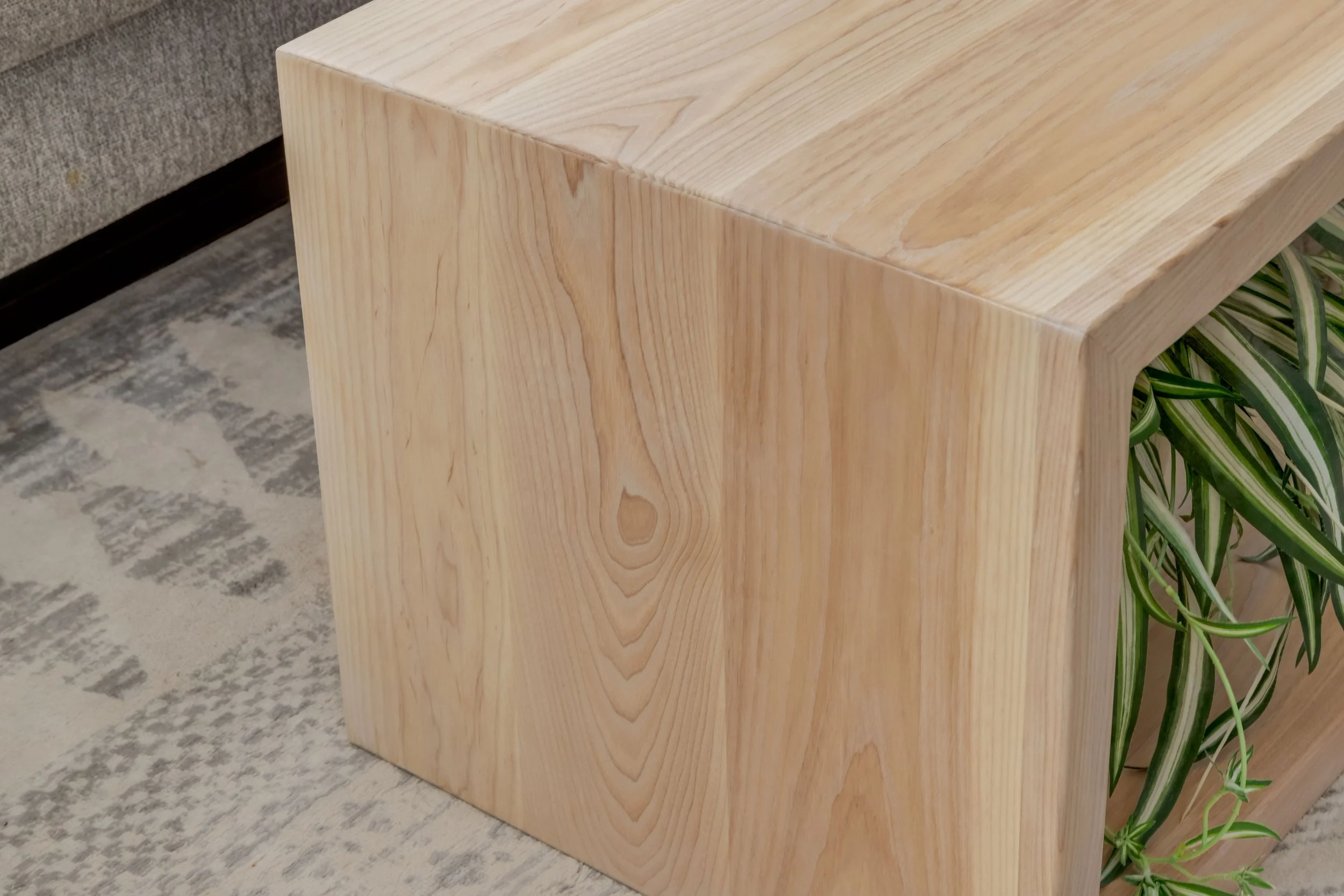 This solid White Ash waterfall edged coffee table is stunning in any home. Perfectly mitered corners create a seamless look.
