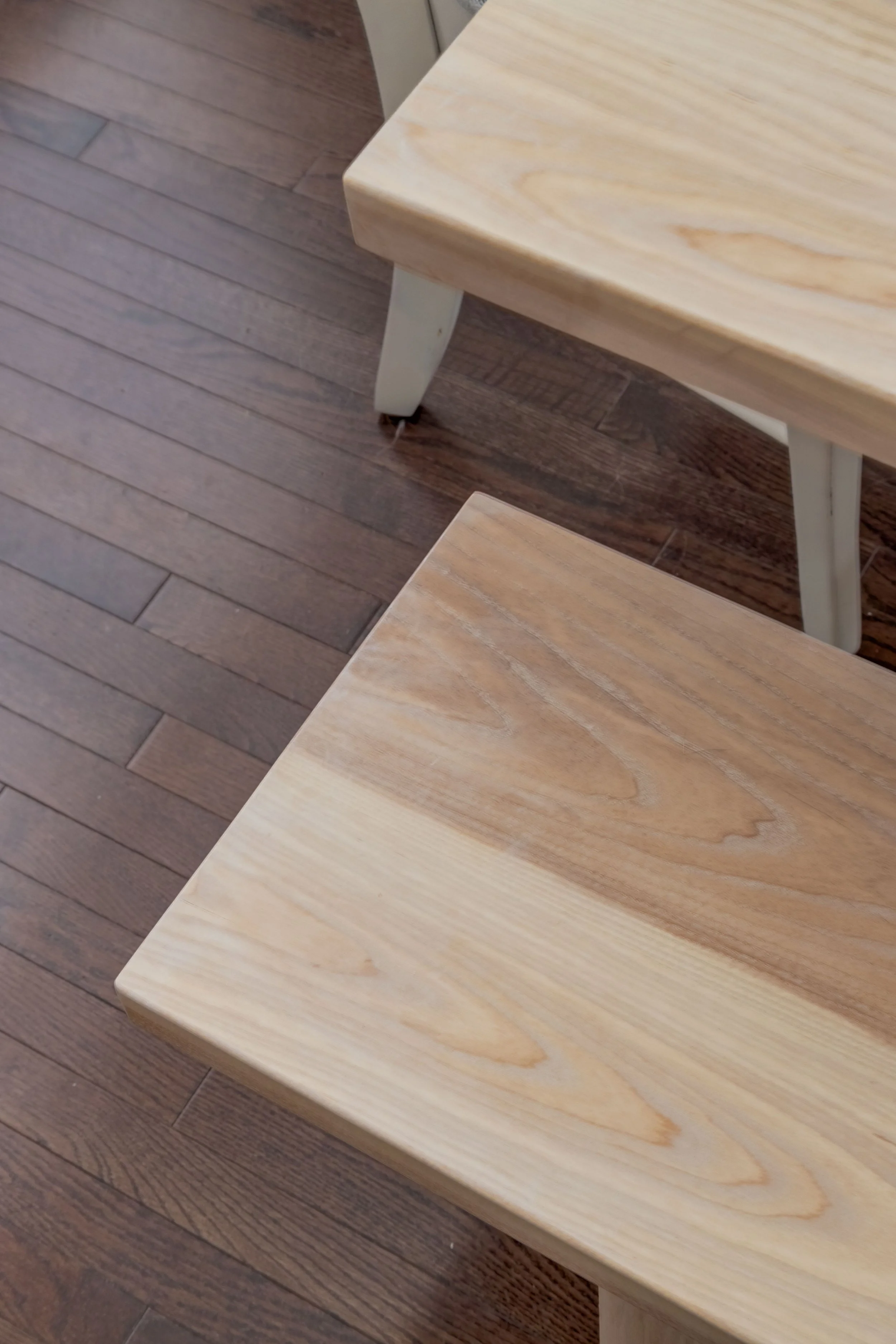 Our version is made of White Ash with a 5 degree trestle leg for extra stability and features a solid Ash top. The wood has been sealed, glazed with a white wash, and finished with 3 coats of high quality top coating.