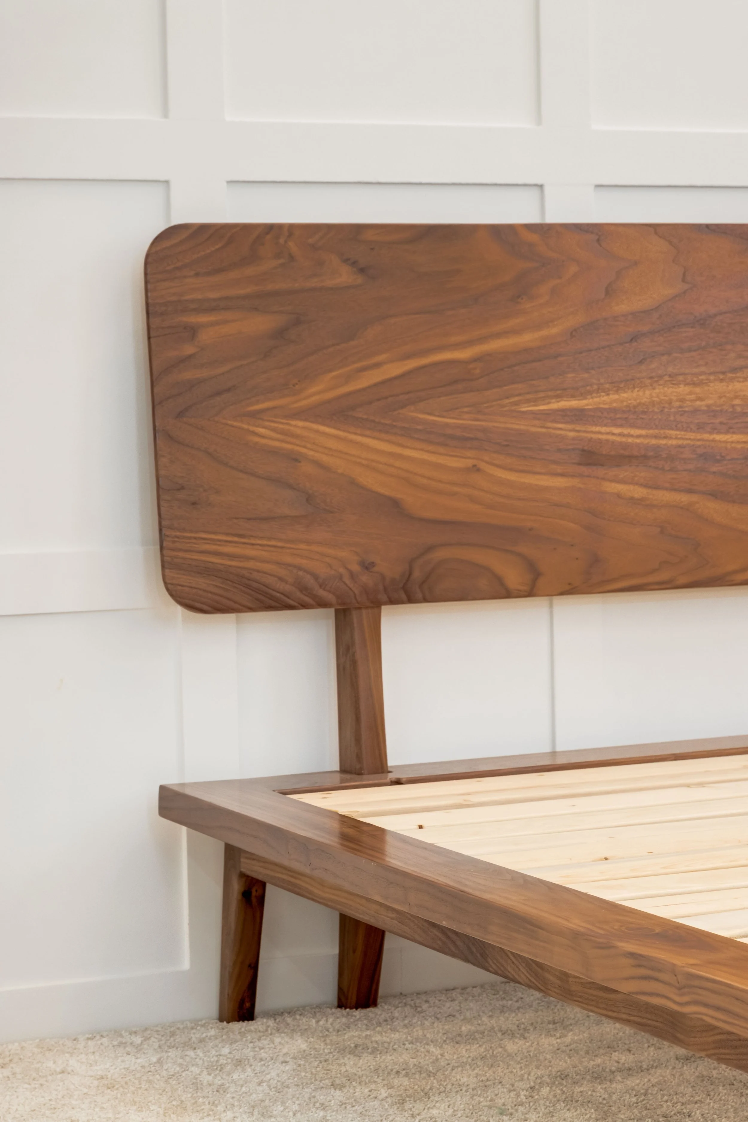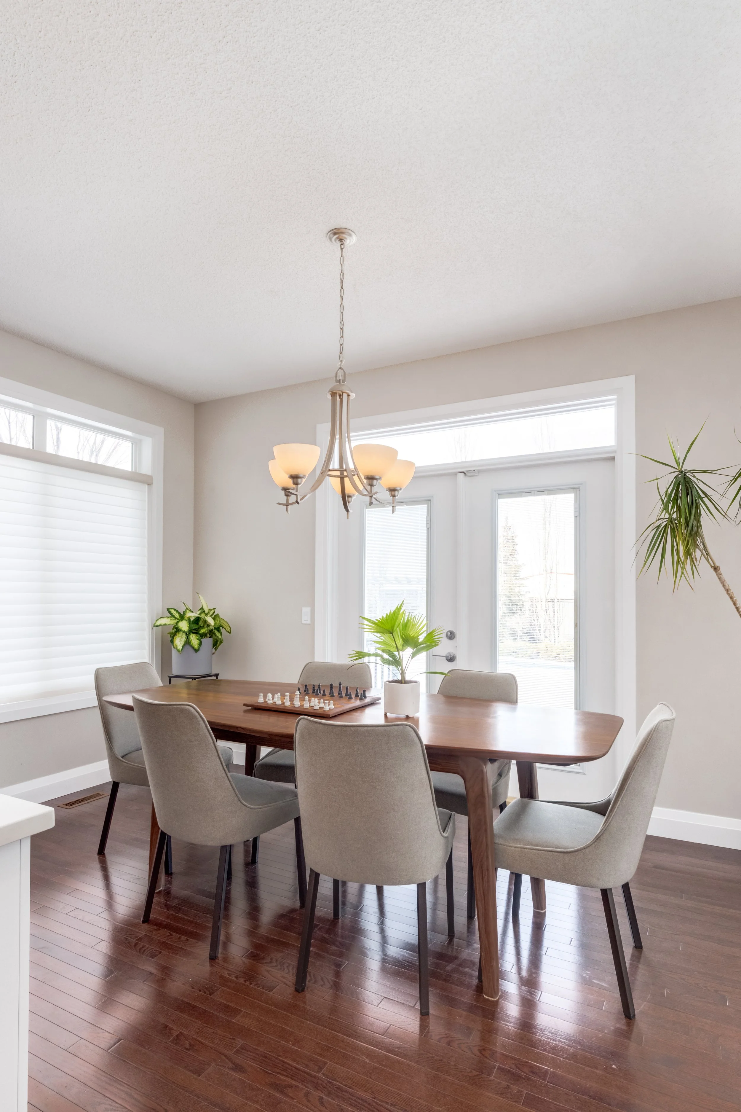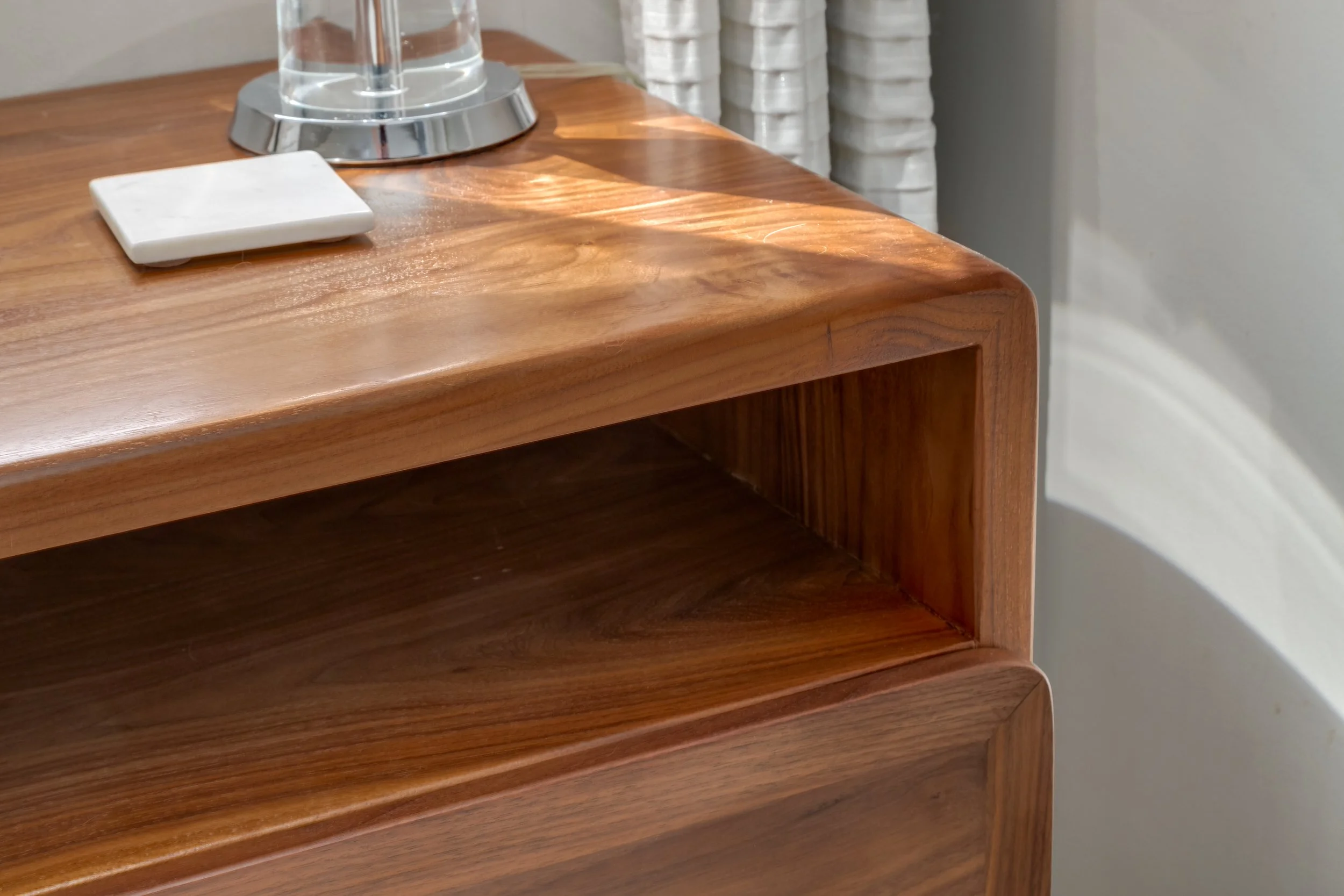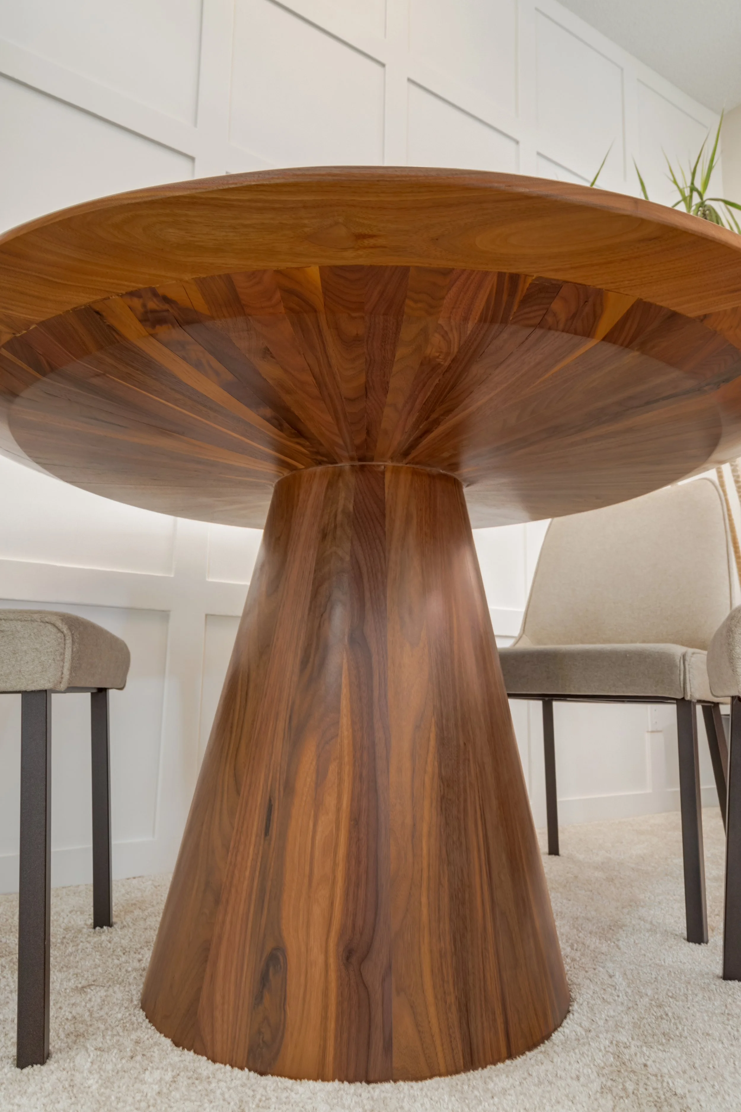 This table started with a client who had seen a table on a popular television show set in the 1950s. It was six sided and very mid century in style. The client loved the shape but wanted an updated, more organic feel to their table. This table features a central leaf that rides upon 3 pieces of metal rails with a 60 degree bevel cut to match the bevel of the table edge. The table top is 1.625 inches solid walnut with a sculpted, cut back edge which tapers to a 1/4 inch reveal. The top features a grain through construction to appear as one solid piece despite the centre opening. The legs are solid wood and elegantly tapered and are connected to the centre stretcher rails via mortise and tenon joinery. Absolutely elegant from every angle.